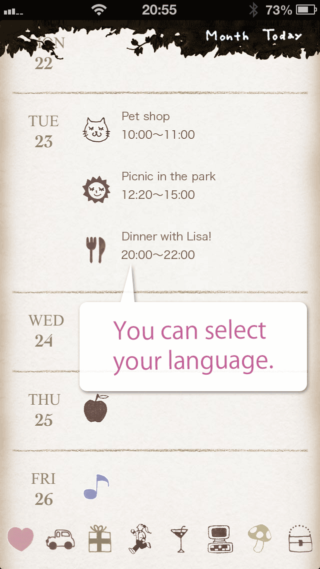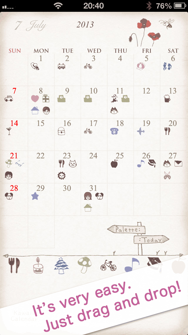 There are many Kawaii icon(stamp) in the pallet. You can make your own calendar with drag and drop .