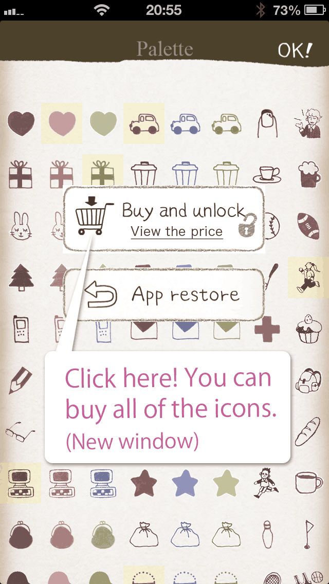 アイコンの種類は430個以上。すべてのアイコンを使いたい場合は、パレット画面から購入してくださいね。