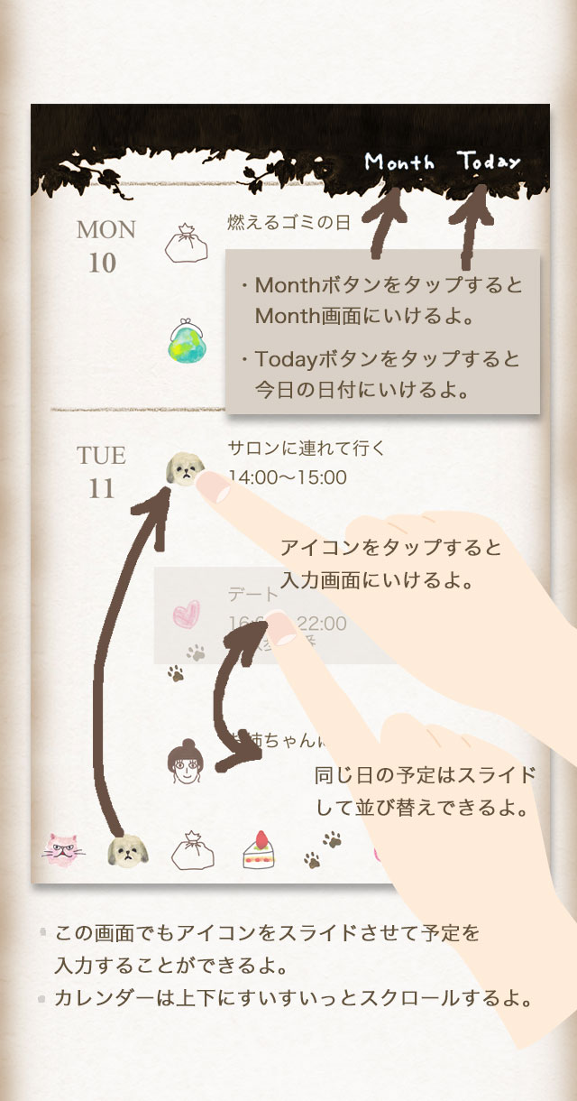 1.画面下に並んでいるアイコンを指でスライドさせて、予定を入れたい日に落としましょう。