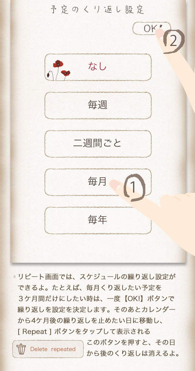 4.メモ記入ページで【Repeat】を押すとスケジュールの繰り返しができます。[ゴミ箱]アイコンをクリックすると予定が消せます。